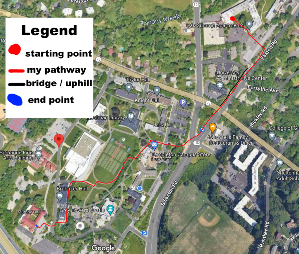 I have a short achilles tendon, this means that a tendon in my heel is short, so everytime that I have to walk that tendon has to stretch and that puts me in a lot of pain after only walking for a short amount of time. This problem is largely avoided by the stretching I do and the inserts I have in my shoes to help me, however it is still an issue when it comes to carrying heavy weight, walking uphill, and walking fast. The path of Easton Road goes very uphill, and there is even a bridge area that is next to housing and goes over a road. This uphill area has caused me a lot of pain in the past, especially when my classes require me to carry a laptop. The laptop that I have, and have had for 8 years now, is thick and heavy. So carrying a backpack with all of my notebooks and my thick laptop, and walking uphill for about 4 minutes lead to me being in intense pain even before reaching Arcadia’s campus. On my latest excursion doing this path I made it about 2:46 seconds before the pain started to settle in, and it took me 3:24 to reach the crosswalk to make it onto campus. This crosswalk had become my favorite part of the journey thanks to the red light I arrived at, meaning I was able to stand still and cease walking so that my heels wouldn’t be working overtime. The advice one might give me is that I should walk slower, and sit down in places to catch my breath, reset my pain, and to take my time. The issue is, my classes have a set start time and I have had classes as early as 8:30 in Murphy, I do not have the luxury of taking my time walking.